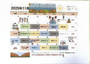 2025年11月の月間プログラムカレンダーです。 人間関係・社会性健康・生活運動・感覚言語コミュニケーション認知・行動以上の内容で色分けしています。 プログラム内容は状況により変更になる可能性があります。